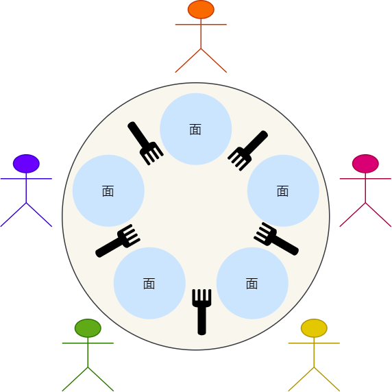 - 巧就巧在,这个桌子只有 5 支叉子,每两个哲学家之间放一支叉子;