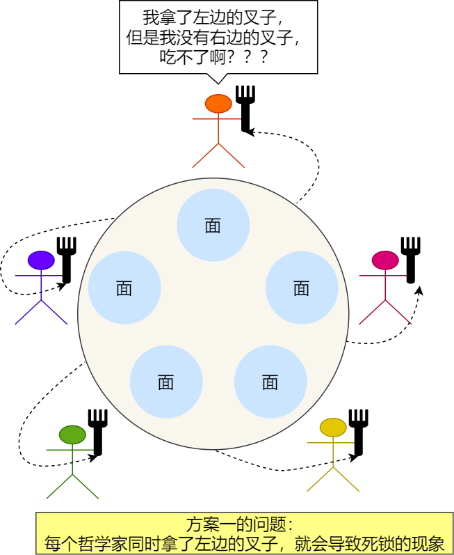那么问题来了,如何保证哲学家们的动作有序进行,而不会出现有人永远拿不到叉子呢?