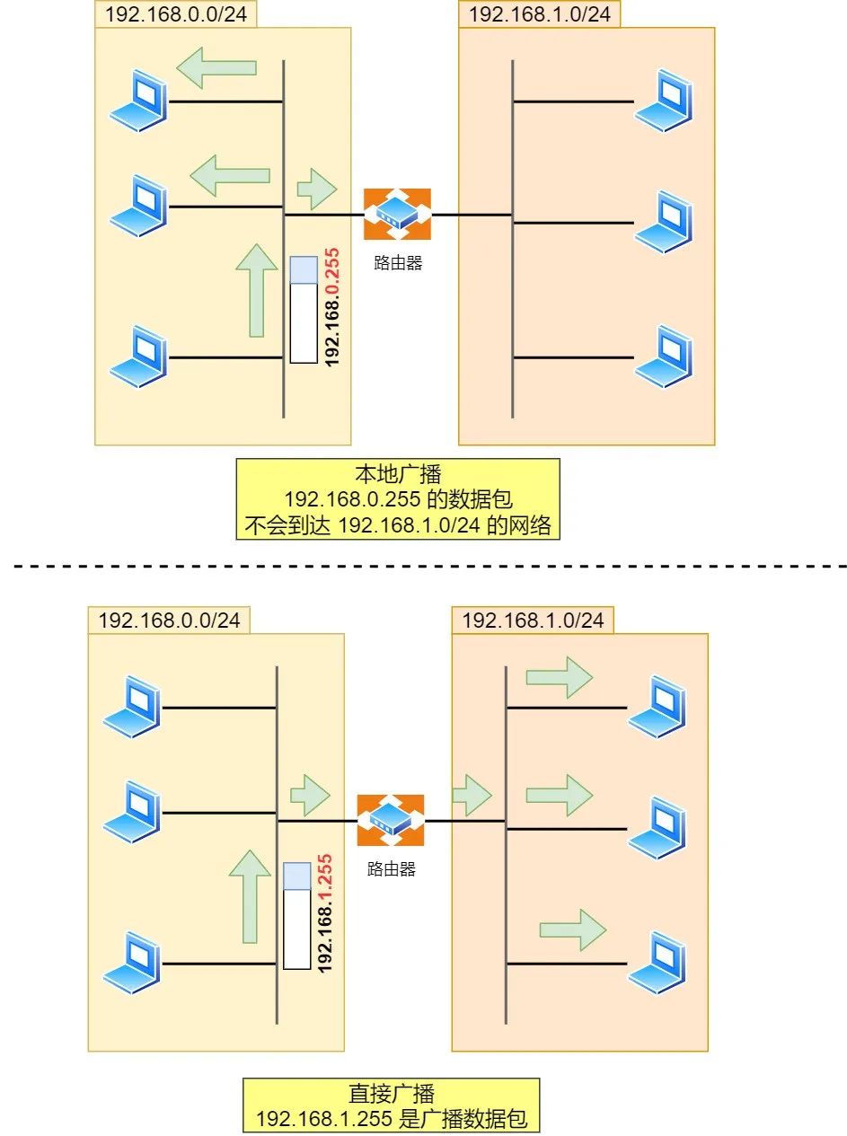 由于直接广播有一定的安全问题,多数情况下会在路由器上设置为不转发)