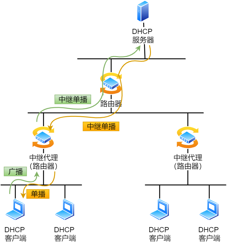 - 服务器端收到该包以后再向 DHCP 中继代理返回应答,并由 DHCP 中继代理将此包转发给 DHCP 客户端