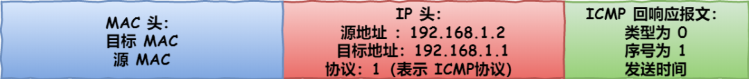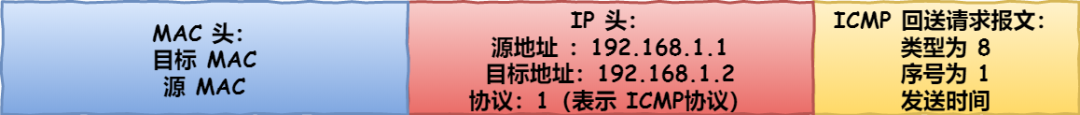 每发出一个请求数据包,序号会自动加 1。为了能够计算往返时间 RTT,它会在报文的数据部分插入发送时间然后,由ICMP协议将这个数据包连同地址 192.168.1.2 一起交给 IP 层。IP 层将以 192.168.1.2 作为目的地址,本机 IP 地址作为源地址,协议字段设置为 1 表示是 ICMP 协议,在加上一些其他控制信息,构建一个 IP 数据包