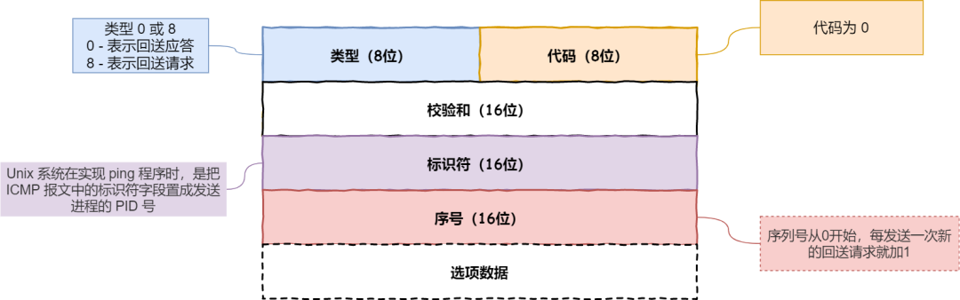ping 命令执行的时候,源主机首先会构建一个 ICMP 回送请求消息数据包,其中ICMP数据包内包含多个字段,最重要的两个为: